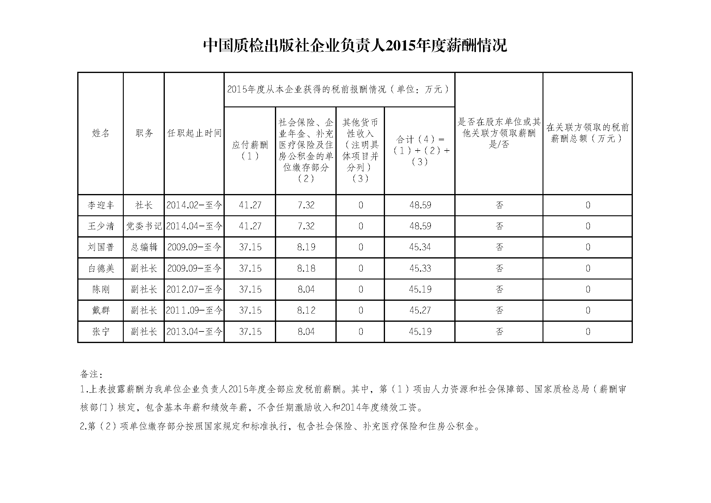 根据人力资源社会保障部关于做好、企业负责人薪酬信息披露工作的要求,经审核,现将、质检出版社企业负责人2015年度薪酬情况披露如下: