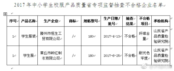本次共抽查了全省40家企业生产的40批次中小学生校服,抽查发现滕州市恒生工贸有限公司、章丘市岭红制衣有限公司这两家企业生产的校服不合格。不合格项目涉及纤维含量、耐光色牢度。