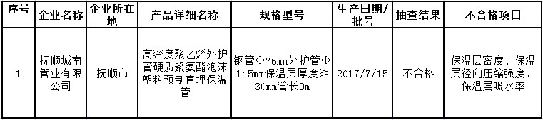 近期,辽宁省质量技术监督、对本省生产的直埋保温管产品质量进行了监督抽查。本次共抽查30家直埋保温管产品生产企业生产的30批次产品,经检验,1家企业生产的1批次产品不合格。