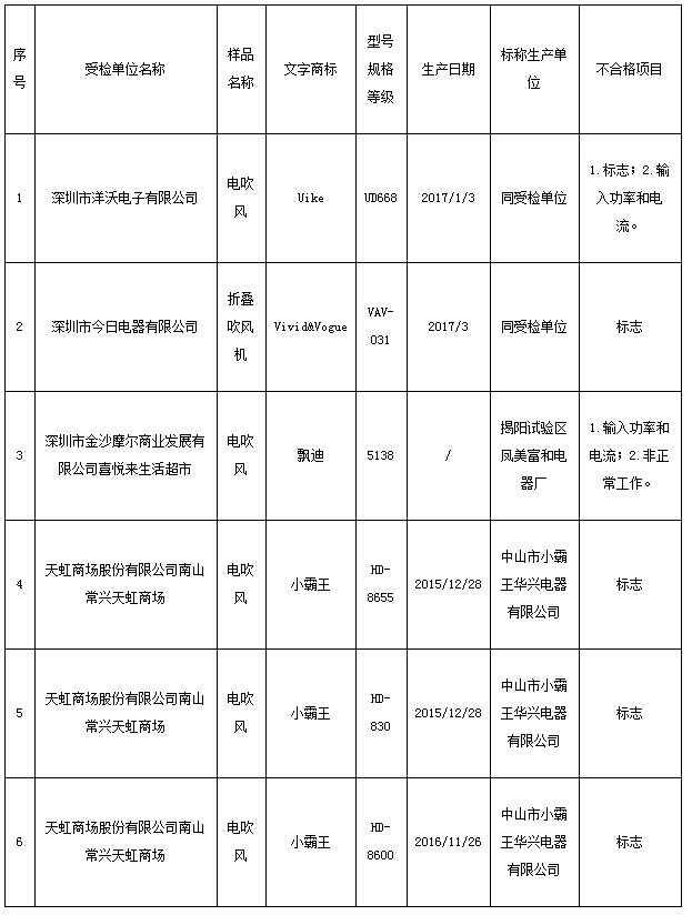 2017年第二季度,深圳市市场监管、组织开展了电吹风产品质量监督抽查。本次监督抽查共抽查检测19家受检单位生产销售的38批次产品,发现不合格产品6批次。发现的不合格项目主要有:标志、输入功率和电流、非正常工作。