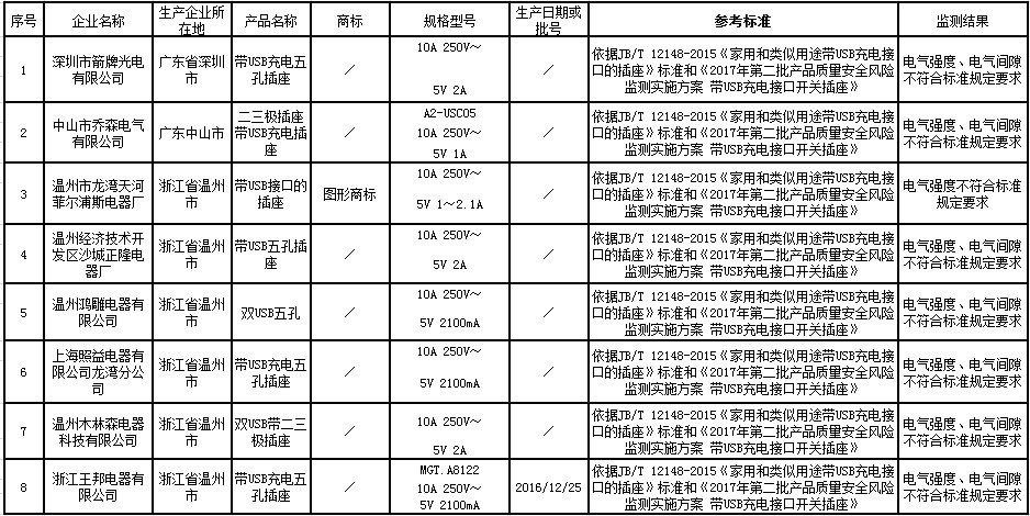 其中,本次风险监测的带USB充电接口的插座样品采集自北京、上海、浙江、广东等省市,共抽取了20家企业生产的20批次样品,依据JB/T12148-2015《家用和类似用途带USB充电接口的插座》标准和《2017年第二批产品质量安全风险监测实施方案带USB充电接口开关插座》,重点对带USB充电接口的插座的电气间隙、绝缘电阻和电气强度项目进行了。监测结果显示,有8批次样品电气强度不符合标准规定要求,有7批次产品电气间隙不符合标准规定要求。