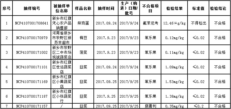 新乡市食药监、11月17日发布“关于对2017年第5期食品安全监督抽检情况的通告”,通告称,近期,新乡市食品药品监督管理、在新乡市食品安全监督抽检任务中,抽检了畜禽肉类、蔬菜、水果类、水产品、鲜蛋、豆类6类食用农产品285批次样品,抽样检验项目合格样品278批次,不合格样品7批次。