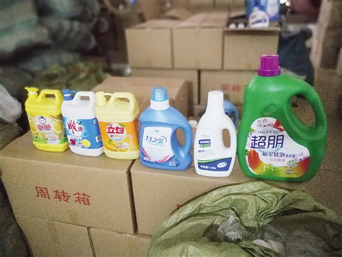 民警打开屋内纸箱,发现里面装着不少塑料瓶,瓶身粘贴有知名品牌“立白”“雕牌”“白猫”等名称,还有3个不知名的洗衣液牌子。