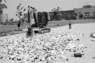 通过近一个小时挖掘机碾压,1.4万余只空瓶被全部销毁。