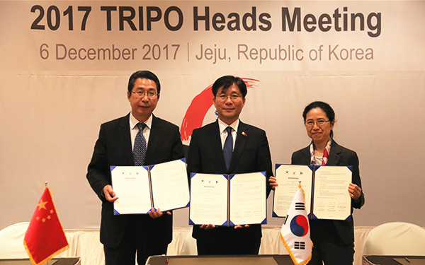 12月6日,第17次中日韩知识产权、、长会议在韩国济州市举行。、、知识产权、、长申长雨、韩国特许厅厅长成允模、日本特许厅长官宗像直子出席会议。三方总结了一年来中日韩三、在各个合作项目中所取得的成果,积极评价了中日韩三、合作的进展,就未来中日韩三、合作交换了意见,确定了明年的合作计划,并签署了《第17次中日韩三、、长会议会谈纪要》。