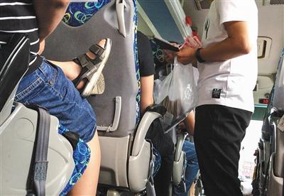 8月19日,在前往长城的旅游大巴上,导游向游客收钱购买滑车往返票。