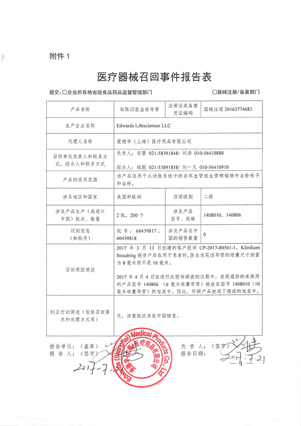 爱德华(上海)医疗用品有限公司对取陈旧型血栓导管主动召回