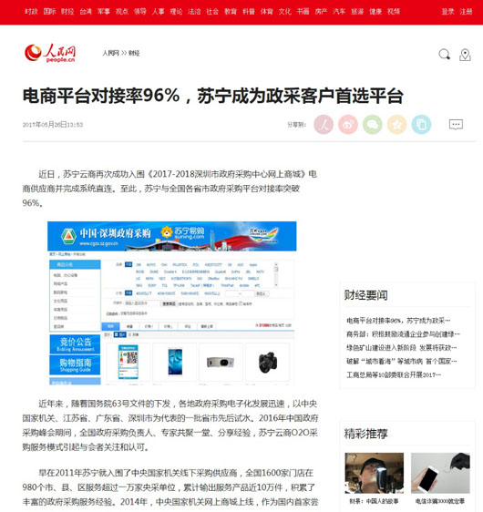 今年5月,人民网报道了苏宁再次入围深圳市、采购中心网上商城电商供应商并完成系统直连的消息,据报道,苏宁与、各省市、采购平台对接率突破96%。
