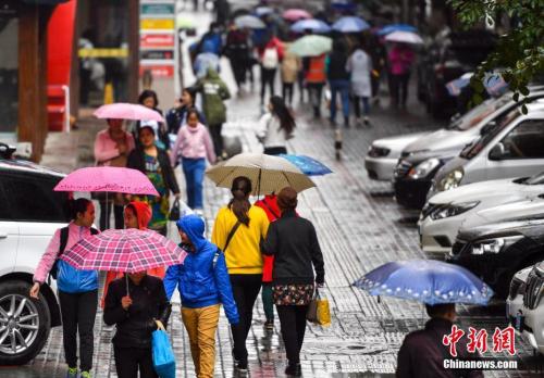 9月24日,新疆乌鲁木齐市降下秋雨,外出民众打着雨伞快步前行。 中新社记者 刘新 摄