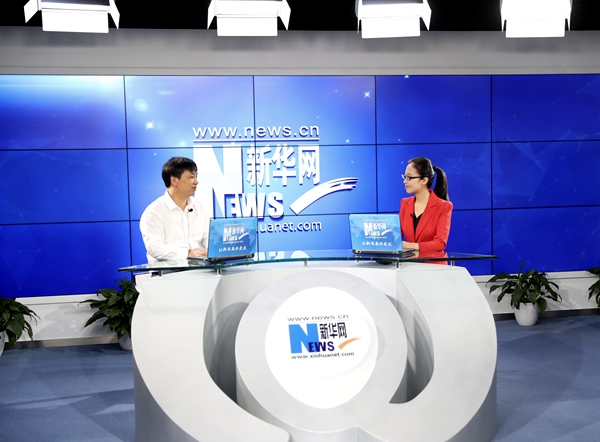 上图为浙江省诸暨市枫桥镇、委书记金均海(左)做客新华网“E观天下”