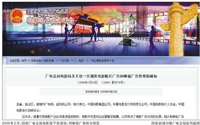 实际上,早在2004年6月,、广电总、、、工商总、曾发布过《关于加强影片贴片广告管理的通知》,明确要求影片贴片广告不得占用电影放映时间,电影院要对放映的贴片广告时间予以公告,未经影片版权方同意任何单位不得搭载、删减贴片广告。2009年2月,、广电总、电影、发布《关于进一步规范电影贴片广告和映前广告管理的通知》,其中提及,影院电影放映存在“广告占用放映时间的问题更为突出,严重损害了消费者的利益,引起了广大观众的强烈反感”现象,并据此重申,“贴片广告、映前广告一律加在《电影片公映许可证》前,并在电影票面上标注的放映时间前放映”。