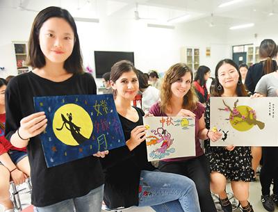 9月26日,德国留学生在安徽淮南师范学院美术课上制作中秋主题美术作品。 陈 彬摄(人民视觉)