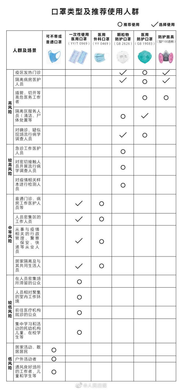 在新型冠状病、感染的肺炎流行期间,建议选择合适的口罩类型,不过度防护。按防疫工作、质和风险等级提出以下指引: