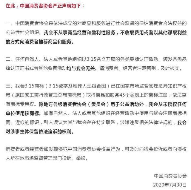 北京时间7月30日,中消协在网站微信公众号发布声明称,任何自然人、法人或者其他组织以3·15名义开展的各类品牌认证活动、颁发各类品牌认证证书或者其他收费活动均与中消协无关。