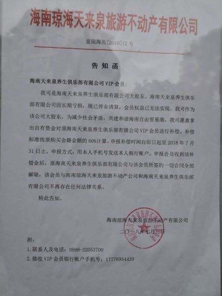 记者在一份2015年2月发布的《关于支持天来泉养生俱乐部施行会员制相关决议的函》中看到,琼海天来泉旅游不动产有限公司以公司名下所有财产对海南天来泉养生俱乐部有限公司因会员制施行而产生的一切经济风险承担、终责任。