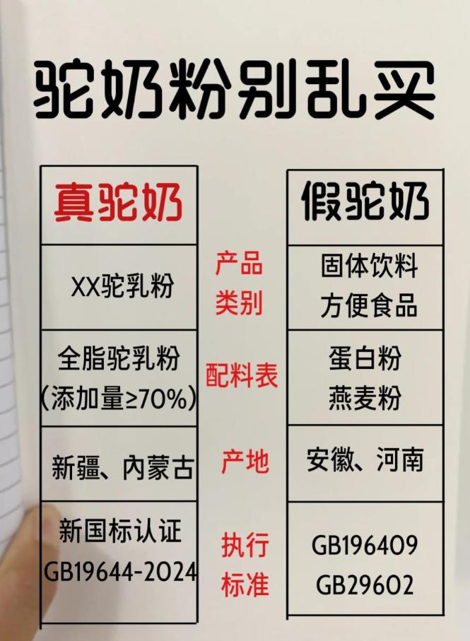 ‌配料表检查‌:真驼奶粉配料应仅标注“生驼乳”或“有机生驼乳”,若出现“乳清蛋白”“植脂末”等添加剂,则为掺假调制乳粉。‌‌