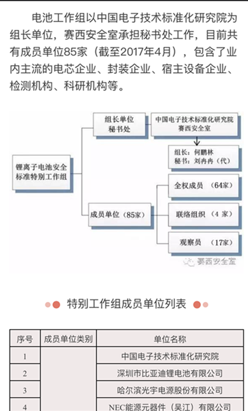 “锂离子电池安全标准特别工作组”由原信息产业部(现工信部)科技司于2008年批复成立,以、电子技术标准化研究院为组长单位秘书处,共有85家成员单位,其中全权成员64家,主要开展锂离子电池安全标准的专项工作,主要职责包括为锂离子电池主管部门提供产业管理技术支持、参与研究制定锂离子电池(安全)标准体系、组织申报锂离子电池、标准行业标准、组织起草锂离子电池(安全)标准、针对标准难点发布工作组决议、组织参与、标准化活动等内容。(能源院 丁志英 林晓萍)