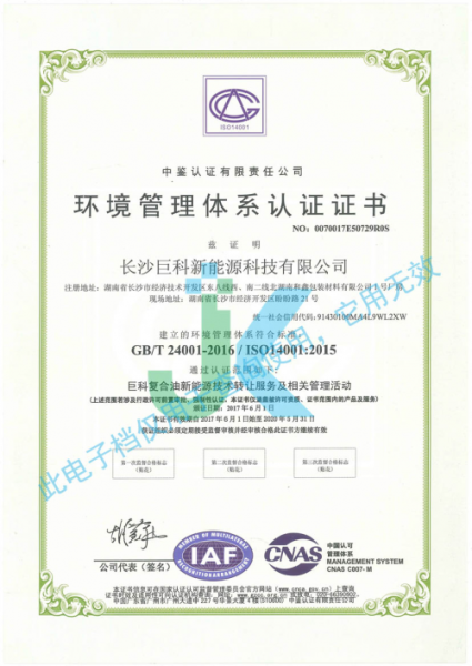 为进一步规范公司生产、科研、销售操作流程、有效控制风险、提高、收益,长沙巨科新能源科技有限公司导入了质量管理体系和环境管理体系,这是公司具有高瞻远瞩目光的体现。长沙巨科新能源科技有限公司获得的这两项证书,为公司将来开拓更广大市场奠定了良好的基础。基石打得稳,才有后面的高楼大厦拔地而起。