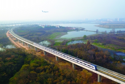 地铁机场线临近天河机场站的高架线路从二跑道南端的湖边划出一道弧线,地铁列车与飞机常在这里交汇