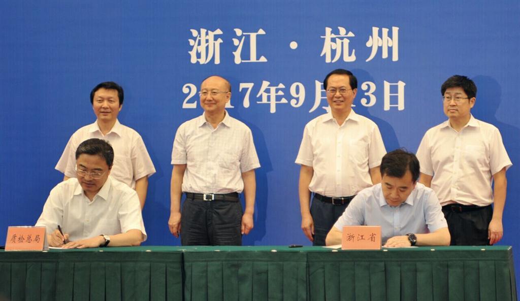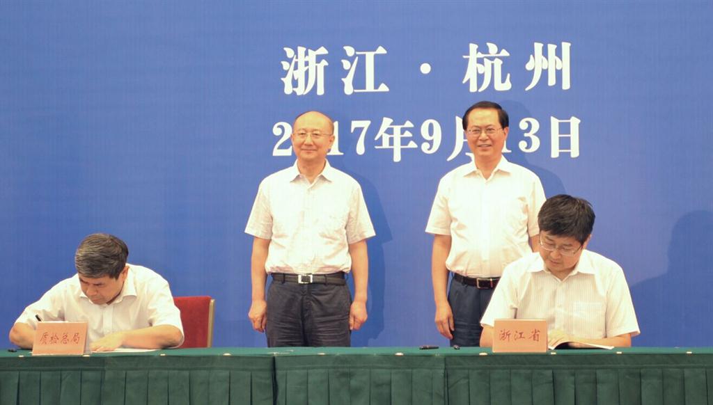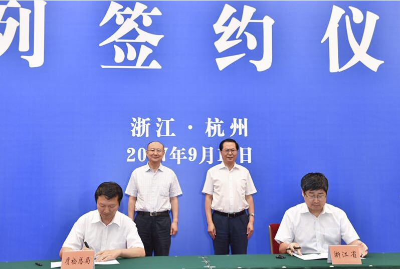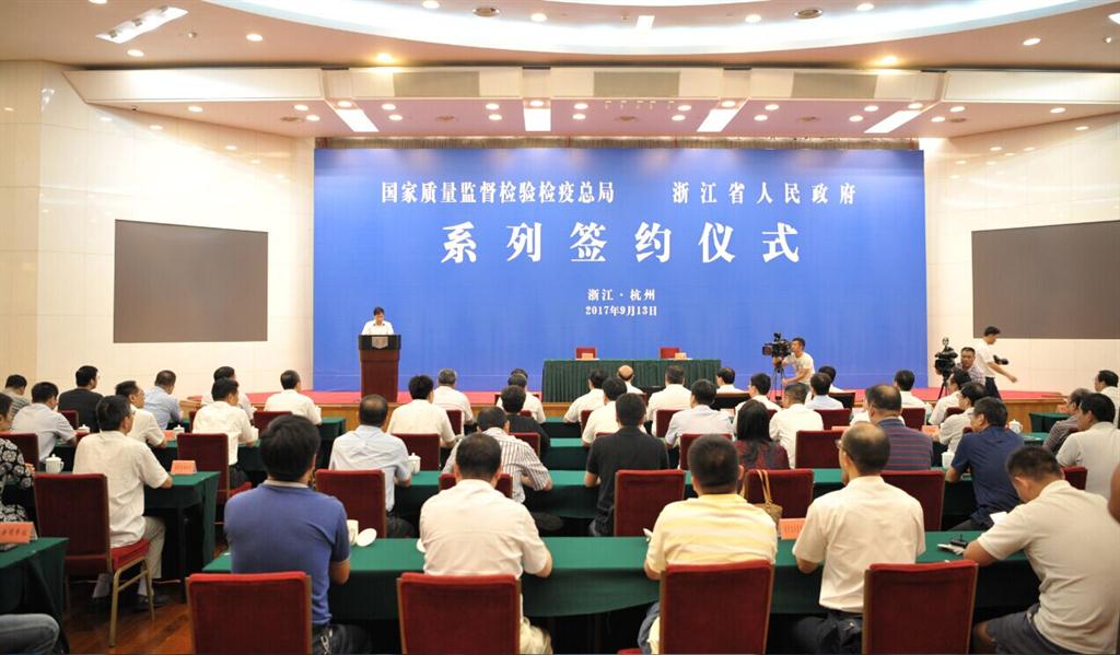 9月13日,浙江省人民、与、标准委、、认监委相关合作方案和合作备忘录签约仪式在省人民大会堂举行。、质检总、、长支树平,、标准委主任田世宏,质检总、、、标准委、、认监委相关司、领导;浙江省省委书记车俊,副省长朱从玖,浙江省标准化综合改革试点领导小组部分成员单位负责人,以及浙江省质量技术监督、领导班子成员等出席了签约仪式。