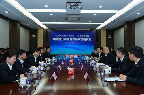 12月27日,市质量技监、与苏宁云商集团有限公司举行质量提升战略合作协议签署仪式。市质量技监、、组书记、、长黄小路,苏宁控股集团、委书记王哲出席仪式并讲话,市质量技监、副、长陈晓、和苏宁云商集团副总裁何丹涛代表双方签约。上海苏宁副总经理王磊,市质量技监、总工程师陆敏出席签约仪式。
