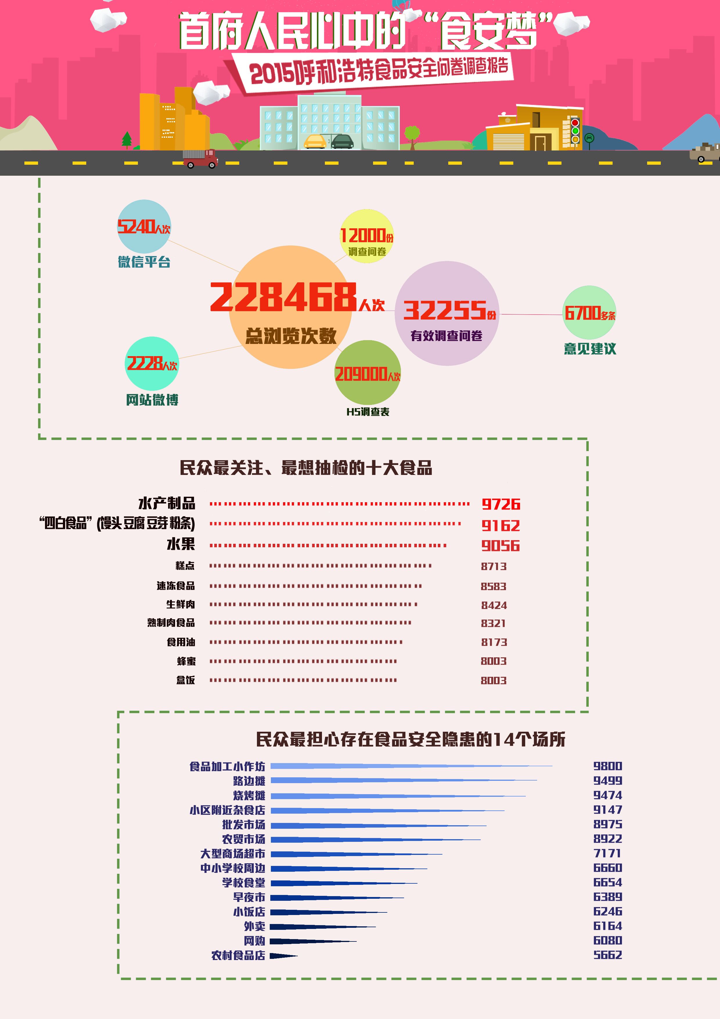 为深入贯彻落实新修订的《食品安全法》和《内蒙古食品生产加工小作坊和食品摊贩管理条例》,进一步提高呼和浩特市监管工作的针对、,提升群众对食品安全的满意度,积极发动广大人民群众共同推进“、食品安全城市”和“食品药品安全呼和浩特”创建工作,切实保障“舌尖上的安全”。2015年10月10日至11月15日,呼和浩特市食品药品监督管理、组织了以“首府人民心中的‘食安梦’”为主题的食品安全问卷、活动。统计结果显示:本次问卷、访问、关注和参与的总浏览量达228468人次,其中:H5、表209000人次、微信5240人次、网站微、2228人次、、问卷12000人次。这是呼和浩特市迄今为止组织的规模、大、范围、广、参与人数、多、影响、远的食品安全民意、。