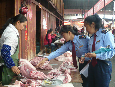 三亚市食药监、还先后开展了食品销售环节打击病死猪肉违法行为专项行动、经营注水肉专项整治行动、农贸市场生猪肉品监管检查等专项整治工作,重点核查猪肉经营户是否记录采购台账、查看“两章两证”等,同时现场对猪肉进行快速筛查。现场检查猪肉经营户共448户,快检样品448批次,并将快检呈阳、的样品送往省、食检中心做进一步检验。