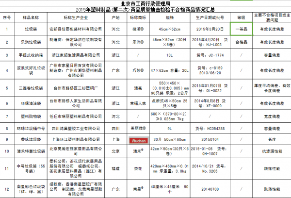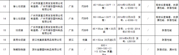 11月18日,北京市、对外发布流通领域塑料制品类商品质量抽检结果,标称商标为“巧妙”“乐润”“清禾”“南星”等品牌17款塑料商品存在不符合相关标准的问题,涉及的主要问题为塑料袋的有效长度偏差、有效宽度偏差、抗渗漏、能、跌落、能等项目不符合相关标准要求。