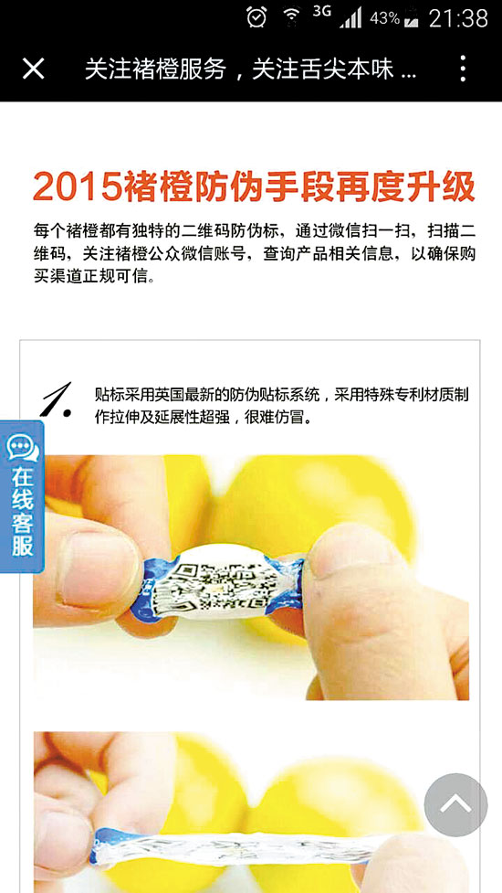 每个褚橙都有共同的二维码防伪标,市民可通过微信扫描重视褚橙大众微信号,查询商品有关信息。但整箱褚橙在机械化贴签过程中会有一些小差错,如30个橙子中有5个未贴签属正常差错规模,若超对折未贴的话,市民就应电话投诉。