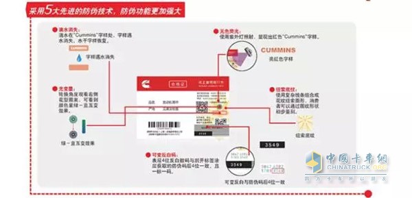 运用紫外灯照耀标签,无色的标签会显示出赤色“Cummins”字样;