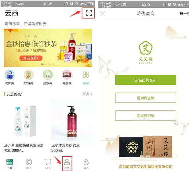 1、下载并打开“来艾”APP,点击首页右上角扫描防伪二维码,或者进入“我的”—“防伪查询”,即可查询真伪。