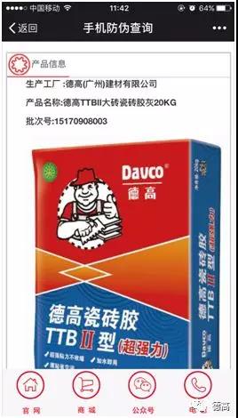 德高防水、瓷砖胶、腻子系列产品均已陆续上线新版防伪标签,