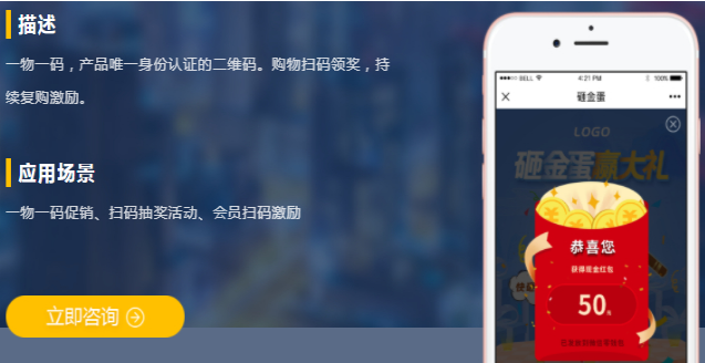 二维码市场营销使企业了解市场营销,、315产品防伪查询中心,一个包括识别真伪、防止商品、促销活动、吸引粉丝等。在一物一码功能菜单下,查看扫描防伪码数据和用户分析。二维码营销成为企业挖掘潜在客户、提高企业竞争力的重要途径。二维码市场营销以一物一码技术为切入点,集防伪跟踪、在线促销、在线活动、交流等于一体。二维码营销作为产业互联网的形式,具有广阔的市场前景。二维码营销是以二维码为主要传播工具的手段,是在线和在线综合营销。二维码获取品牌产品信息有助于大众在短时间内理解和印象品牌。