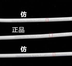 真:正品苹果耳机在接口处20cm的地方用激光打印了一排序列号。它虽然字迹浅浅的,但是很难被擦掉。打印内容根据出厂地不同内容有些许差别,但格式是固定的。比如“Designed by Apple in California Assembled in 、 DTV……”每一小段话的中间是隔开两个空格键。