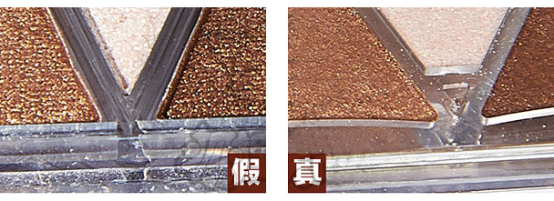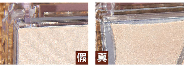 真货眼影盘子的造型是不规则且边缘带弧度的,是高于眼影表面的,是防止眼影粉撒漏的特别设计哦!假货就没有这个设计了,所以看上去感觉假货的眼影粉面积比真货多,其实并不是这样的哈~