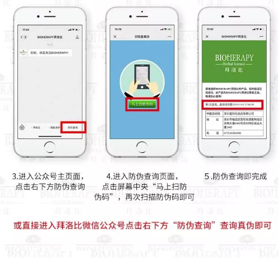 为保护消费者权益及安全,维护品牌正当知识产杈,即日起,BIOHERAPY拜洛比微信防伪识别系统正式上市使用,、大陆地区所售BIOHERAPY拜洛比产品防伪标志陆续启用(批次在2024年11月及以后的产品均贴有防伪标志)。请大家购买到贴有防伪标志的BIOHERAPY拜洛比产品时,通过防伪识别系统扫码确认真伪,扫码方式和瓶身标识如下图所示。