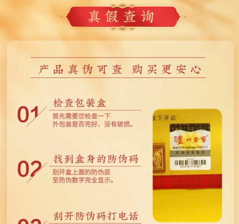 消费者在购买泸州老窖整箱产品时,应首先检查箱子上的防伪标识,确保标识完整无损。对于带有二维码的防伪标识,消费者可以使用手机扫描二维码获取防伪码;对于带有涂层覆盖的防伪码,需要刮开涂层以获取完整的防伪码。