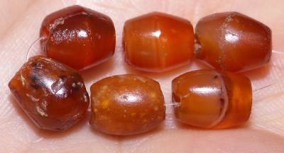 五、还有一些老玛瑙珠子,表面既看不到橘子皮的皱纹和指甲盖儿纹,也不存在盘玩过的痕迹,像这样的老玛瑙珠子的识别的方法一是看做工,二是看玛瑙质感。老玛瑙珠子的刀工下凹处深浅一致,在凸起处的棱角处不加修整。老玛瑙珠子都是天然色的,且带有很强的胶质感。新玛瑙的颜色略有浑浊,相对老玛瑙其是不透明的。
