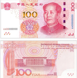 第一榜首,光变镂空开窗安全线 坐落票面正面右侧。当、视点由直视变为斜视时,安全线色彩由品红色变为绿色;透光、时,可见安全线中正反替换摆放的镂空文字“¥100”。