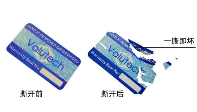 4.VOID防伪标:这类防伪标签一般 是解开型(解开留字)的防伪标签,防止未经审批同意解开、中移动或再贴,物流包装、防盜密封等要用这类标签,一揭即损,一损即现。从承粘物表面揭掉时,板材事先设置的文本或绘画被分离出来出板材,并完好无损地保存在承贴物表面,扯开后的板材与字模没法修复。