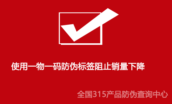 使用一物一码防伪标签阻止销量下降,通过防伪技术实现一物1码,一件产品拥有一个身份编码,降低了制假者因制假成本上升而获利的可能、,有效抵制了假冒伪劣产品的制作。利用电子防伪建设和运营经验,315防伪对产品进行防伪,开发了原理为赋予每个产品一个防伪编码的二维并贴在产品外包装上,消费者可通过手机扫描查询产品真伪。