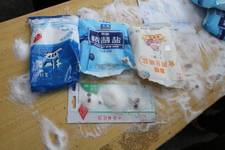 凭手感 精制碘盐用手抓捏较松散,颗粒均匀。假碘盐手捏成团,不易散开。
