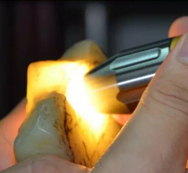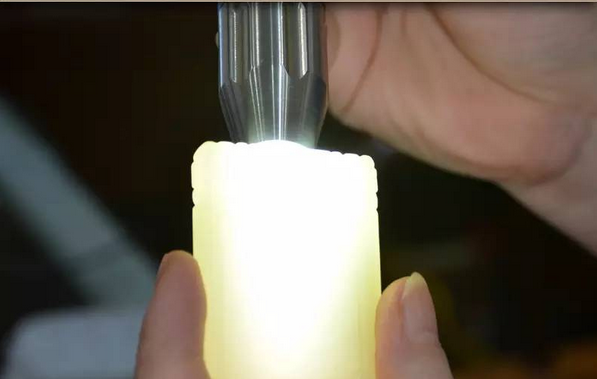 购玉石成品时使用强光手电筒目的比较简章单一,就是观察玉石成品是否有瑕疵、绺裂,是否有可接受的明纹、暗纹等等。购买玉石成品时,可借用店家的强光手电筒对玉石成品通过打光观察,打光的方法是将玉石成品平放由底面向上打光,光线由下到上贯穿整个玉石成品,对于透明或半透明的玉石成品,是否有裂有纹,一目了然。