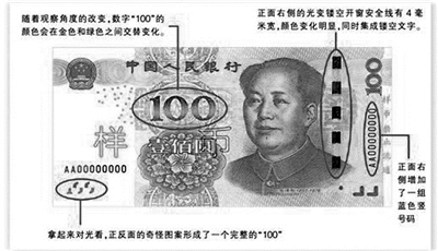 一看光变镂空开窗安全线。坐落票面正面右侧,当、视点由直视变为斜视时,安全线色彩由品红色变为绿色;透光、时,可见安全线中正反替换摆放的镂空文字“¥100”。
