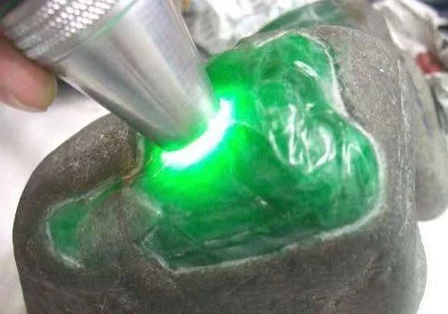 黄梨皮:梨黄颜色,皮薄,打光即可看见内含的颜色,切割后,绿色黄味足,显鲜亮活放.是大马坎、具代表、的块体。