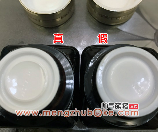 至于瓶盖的辨别,外部精致程度的对比上面已经提到了,下面这张照片是盖子内部的实拍,注意盖子内部材料的颜色不同,左边的真盖子内部塑料颜色要白净一些,右边的假货盖子材料颜色则偏黄了。细节上也可以发现真盖子外边的金色包边很精致的,而假货的则是毛毛糙糙的,包边并不完整。