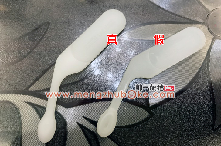 还有这个小挖勺,假货的挖勺颜色与盖子一样同样存在偏黄的问题,另外重点是做的粗糙,挖勺边缘还有好多毛刺都没清理掉,拿在手上感觉就咯手。另外注意挖勺的勺头形状,看看假货的这种工艺,这种样子能用吗?也是让人醉了……