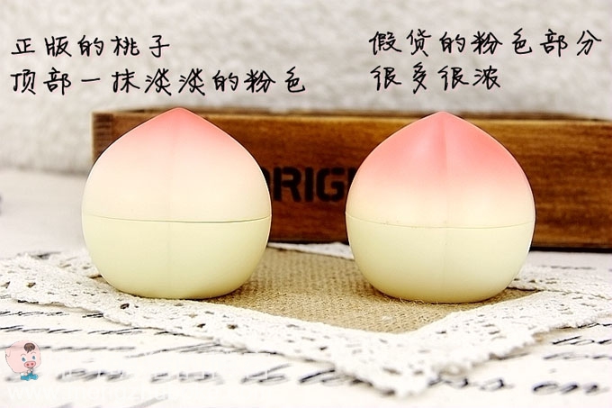 正版的桃子、部一抹淡淡的粉色,假货的粉色部分很多很浓。如果这真是两个水蜜桃,那么正品貌似没有假货熟得透噢!