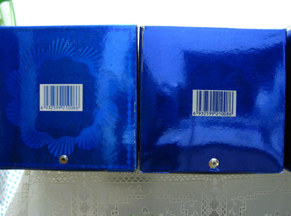 ②如下图所示,左边为真,右边为假,条形码的字体与条形码可以明显区别。真酒条形码旁边仔细看还会发现“海之蓝”字样。