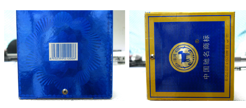 如下图所示,左边为真,右边为假,真酒有生产日期和批号,假酒则没有。